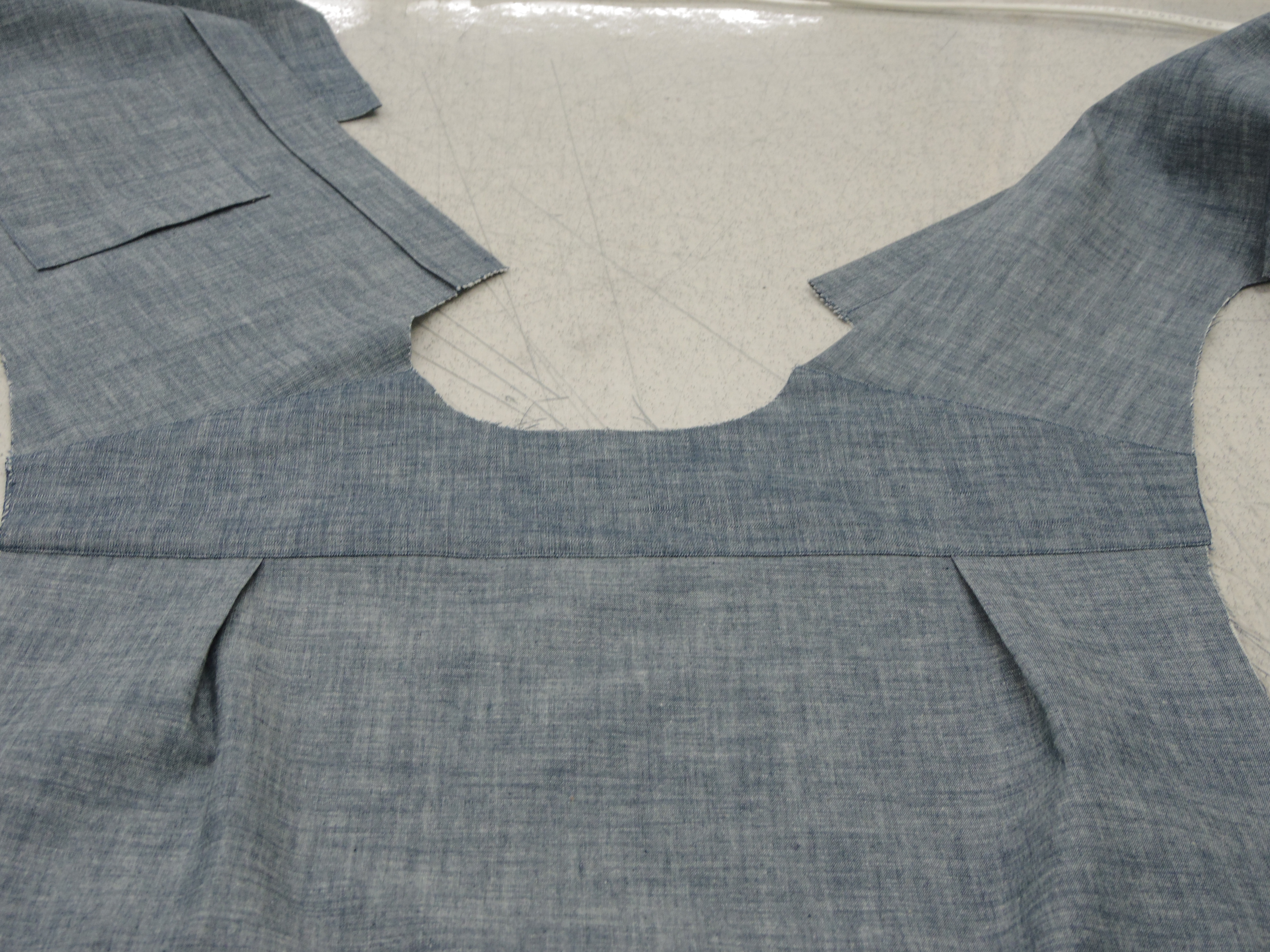(身頃をヨークにしまって中縫いもできますが、生地がクシャクシャになりがちなので、コバのほうが無難でしょう)