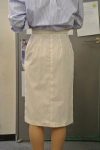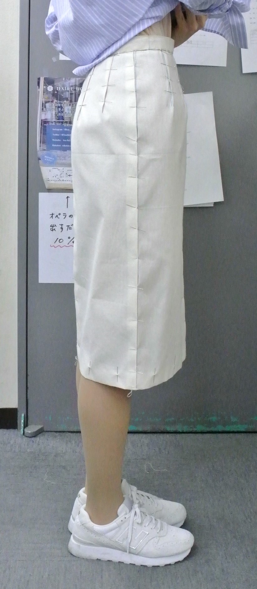 ヒップ寸法が足りなかったり、ダーツ分量や位置のバランスが悪くヒップや下腹部のゆとりが無くなると裾が裾が跳ね上がってしまいます