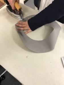 まずはサイドクラウンからの裁断です。共布のベルトもたたきます。