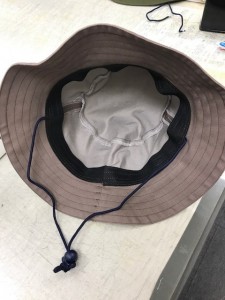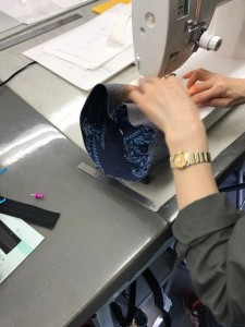 次にブリムを本体に縫い付け、サイズテープ(スベリ)を縫い付けます。