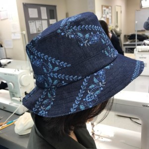 こちらはデニムチームですね。左の方は、水色のこれからの季節にピッタリな色味に、生成りの刺繍ドットが可愛い生地を使い、少しつば広にアレンジして仕上げられました!右の方のレースのような草花模様のデニムも落ち着いた雰囲気の中に可愛らしさを感じますね。どちらも使い勝手がよさそうです。