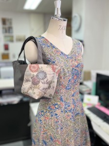 着物や浴衣に合いそうなカゴバック風シルエットを兼ね備えた着物リメイクトートです!