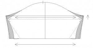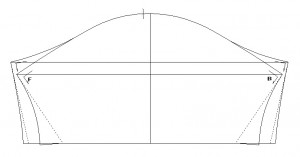斜線を引いた分だけ削ることになるので、細くでき、袖山を高く、袖巾を減らせます。袖ではなく身頃側で運動量を確保します。