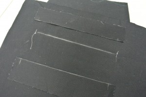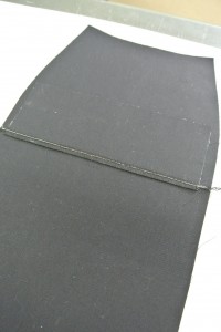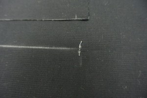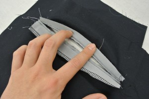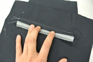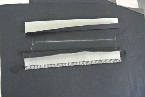 向こう布当て布下端にロックをかけ、袋布にたたきつけます。