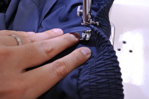 ウエストゴム伸ばし縫いです。限界まで伸ばし縫いに挑戦しましたが、めちゃくちゃ縫いにくかったです・・1.5倍くらい引っ張って縫っていますが、これくらいが限界かなあ・・・