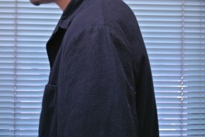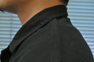 気になっていたのがここです。ちょっとシワがよってしまっていますが、衿が抜けるという事はありません。後ろの衿周りが浮いている状態です。着た時の首の後ろの圧迫感はほとんどありません。ただ、前述どおり肩先に服の重みを感じます。