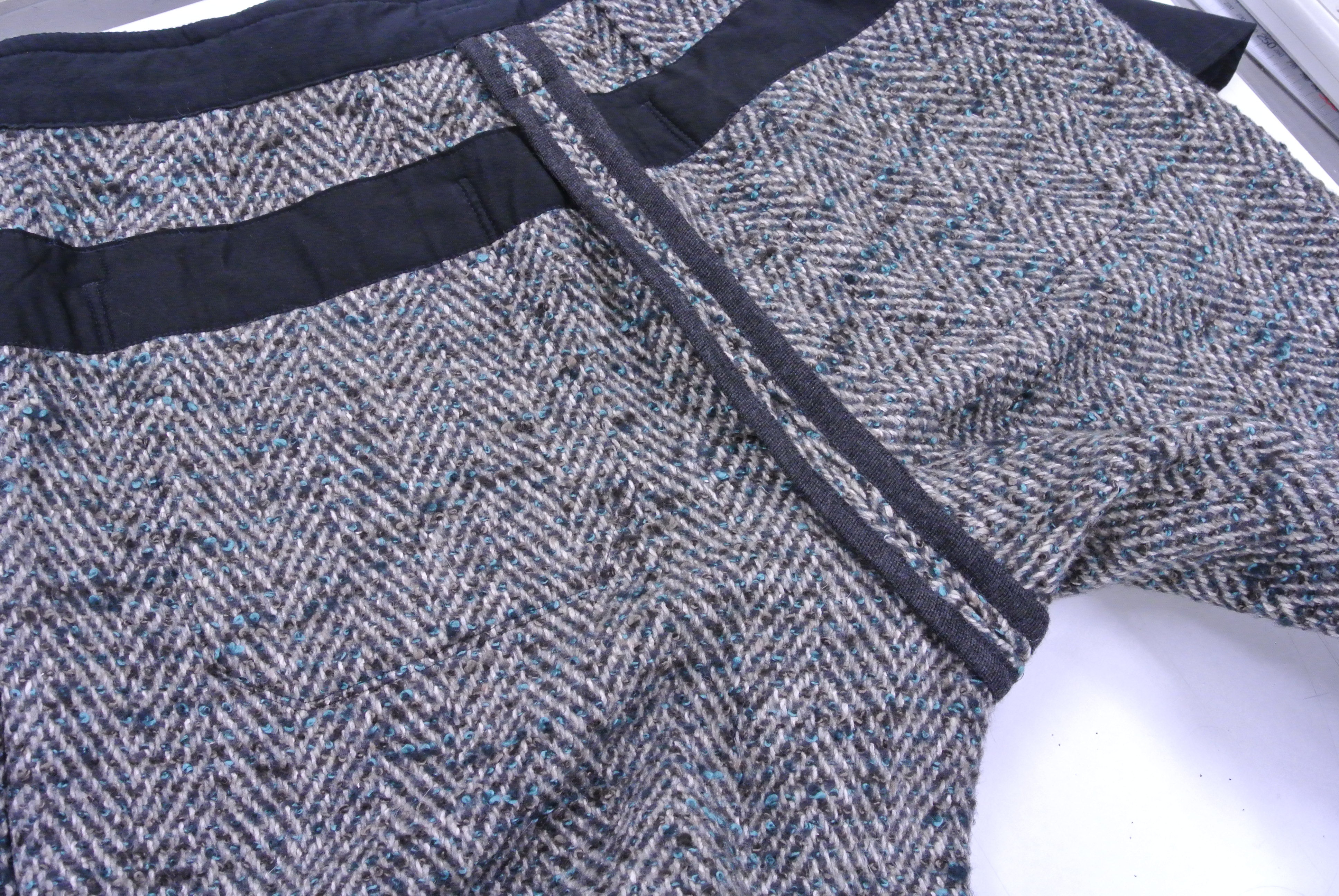 裾は分厚くなるので、何かないかなーと探していたところ、ニットテープというのがあったので、試してみました。ツイードになじみ易く、厚み軽減にも役立つ優れものです。通常のテープだと固すぎて、ツイードのような柔らかい生地に馴染みにくいです。