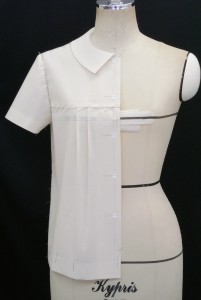 全体の着丈、ボタンバランス、切り替え位置、衿、すべてのバランスを取るようにしましょう。特にこれ以上切り替えを上にすると、ダーツ先がバストポイントから外れるのでバストダーツ処理がしにくくなります。