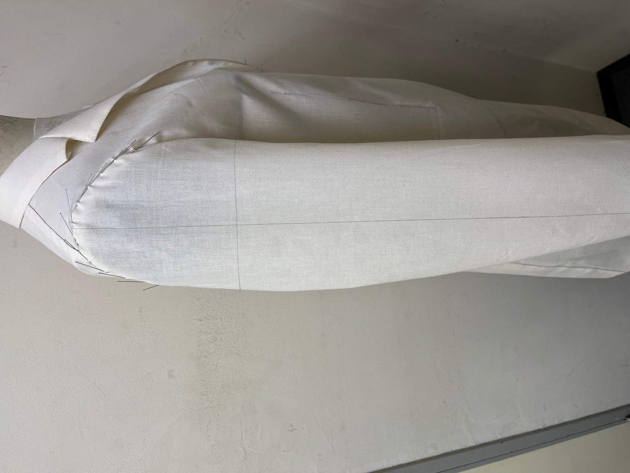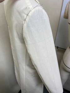 また、ジャケット、コートにしては袖山も低めに設定されています。触ってみた感じだと、いせを多く入れられない生地という理由もありそうです。