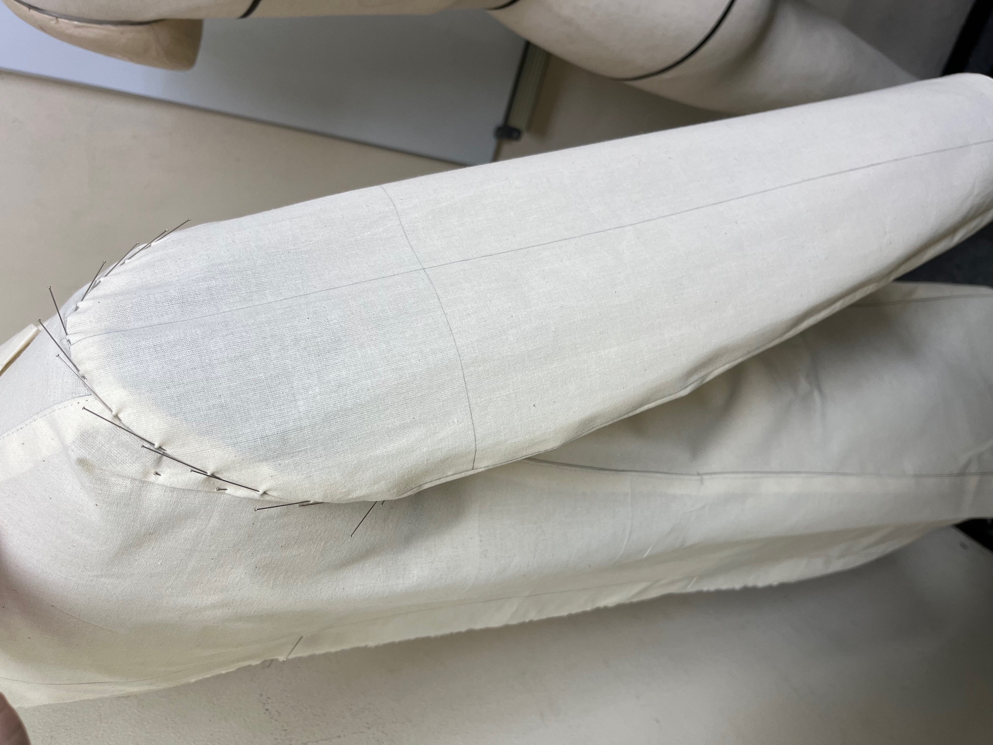このように、ひねりを入れることで、袖山が低くても袖口をこのように身頃に近づけることができるうえ、袖全体が立体的になり、メンズなどでよく見られる腕が強調された形状も作ることができます。