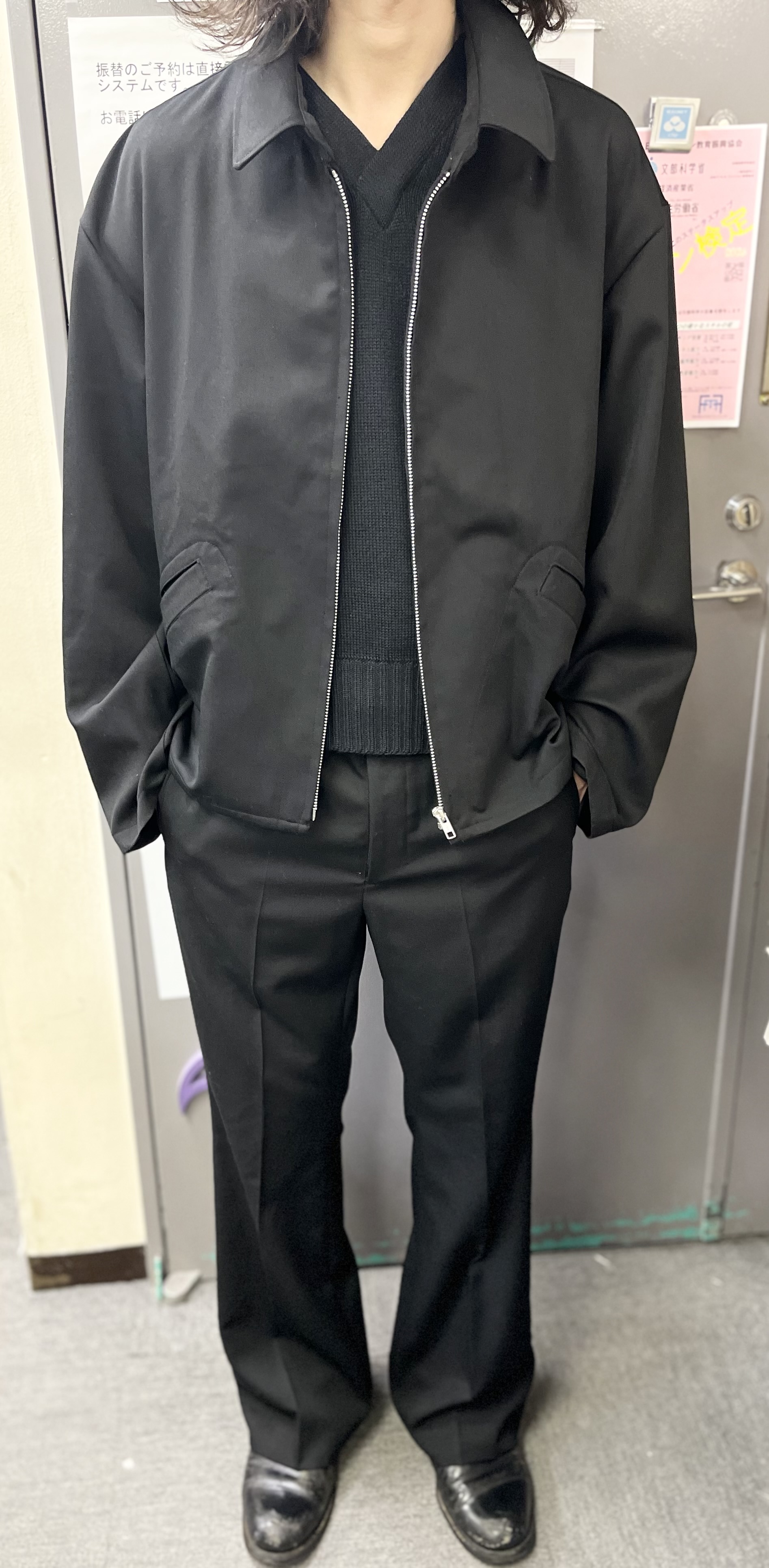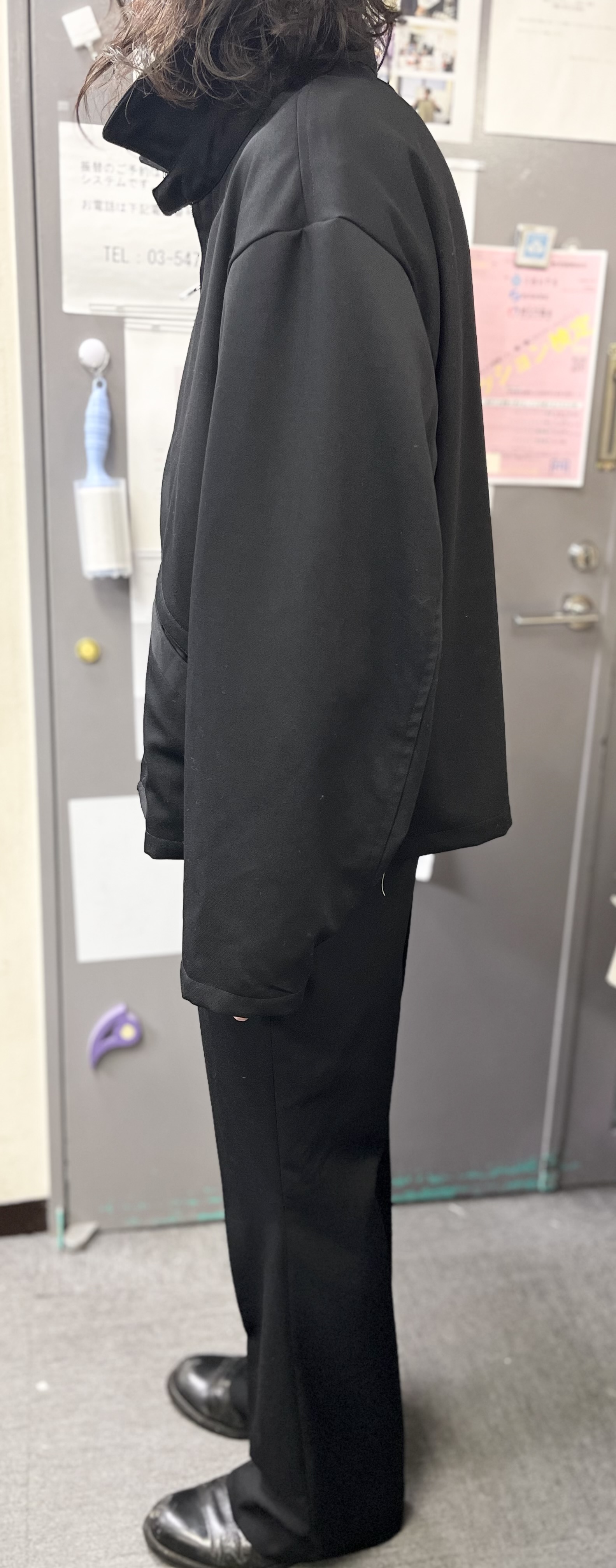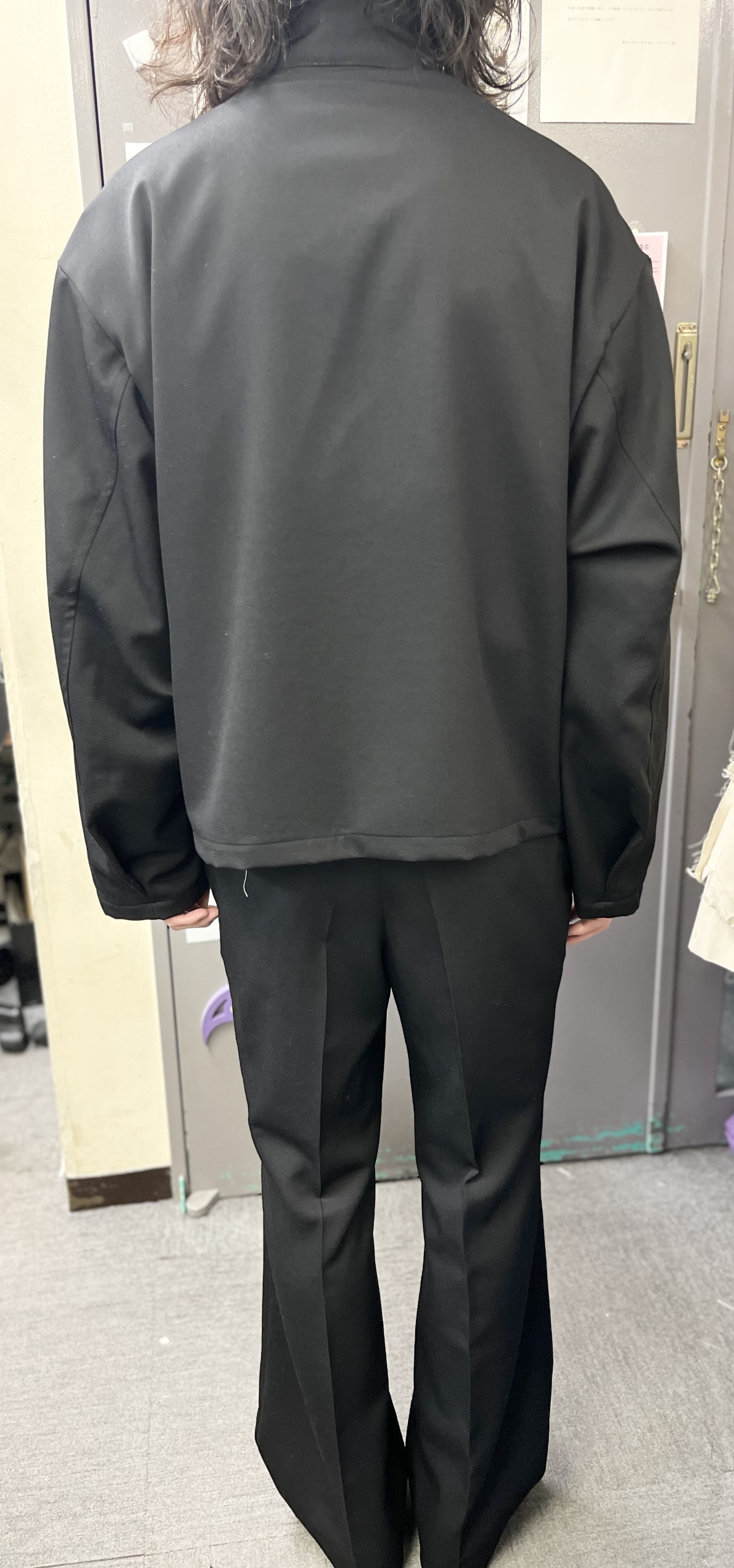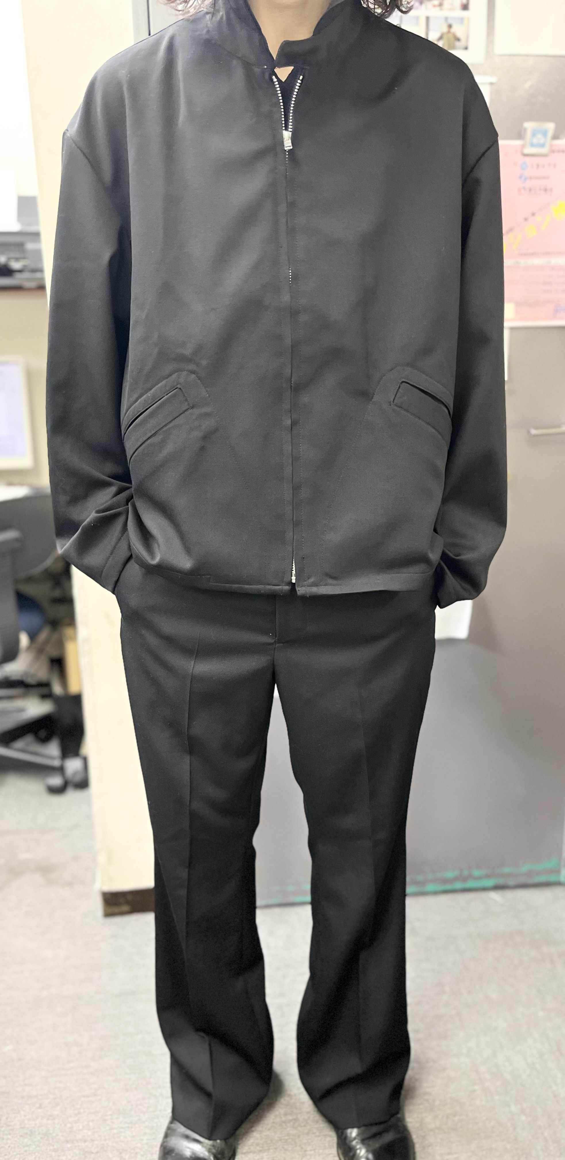 ウールギャバでセットアップでも着用できるジャケットとパンツを作りたいと思っていました。パンツはなるべく細身で綺麗なスラックスを作るというテーマで、ジャケットはせっかくドレープ性のあるギャバで作るので、全体的にゆったりしたジャケットを作りたいと思いました。