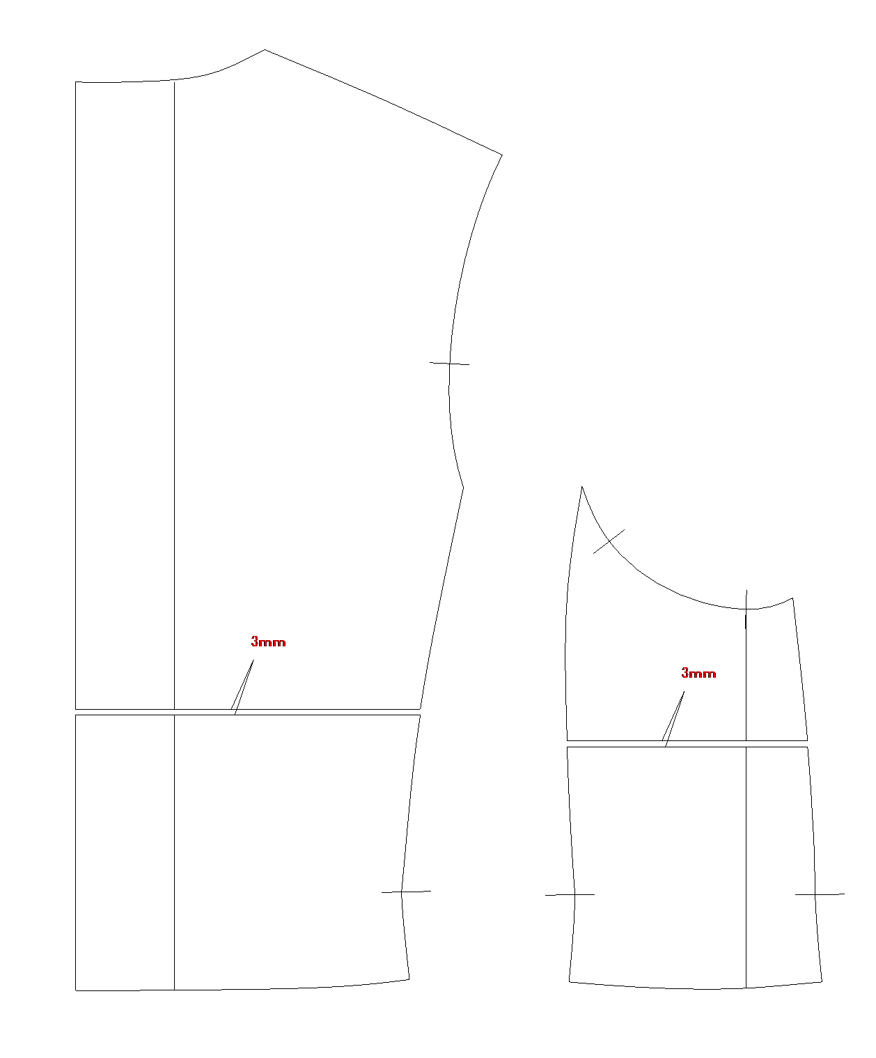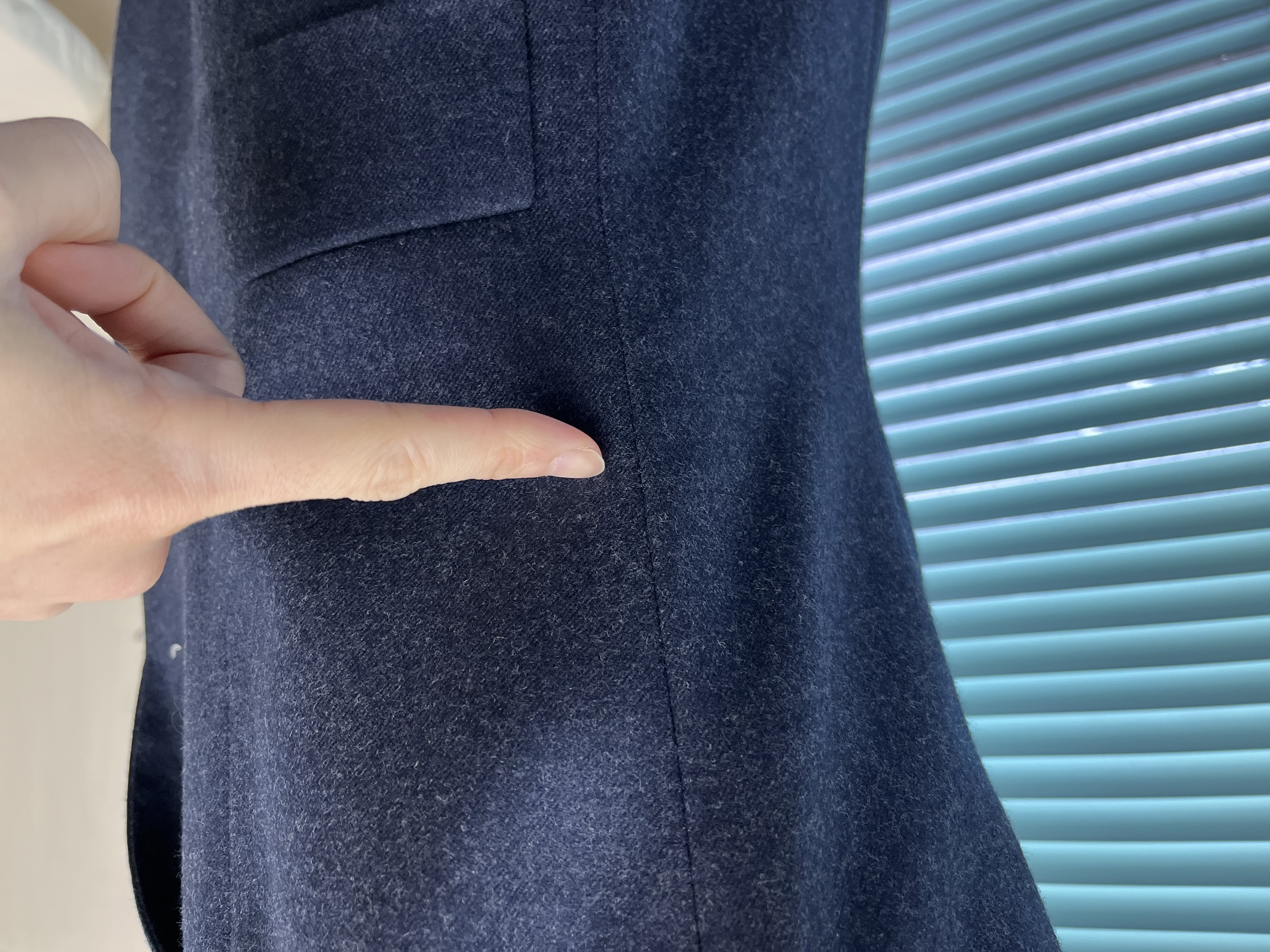 まず何が気になったのかというと、裏地と表地が同じパーツになっていた点です。前身頃に関しては全く同じ全面芯の見返しが付き、後ろ身頃、脇身頃は裏打ちの仕様になっており、裾の見返しは表地裏地共に中縫いしていました。キセなどはなかったですが、寸法を確認したら、実際3mmほど長く作られていました。