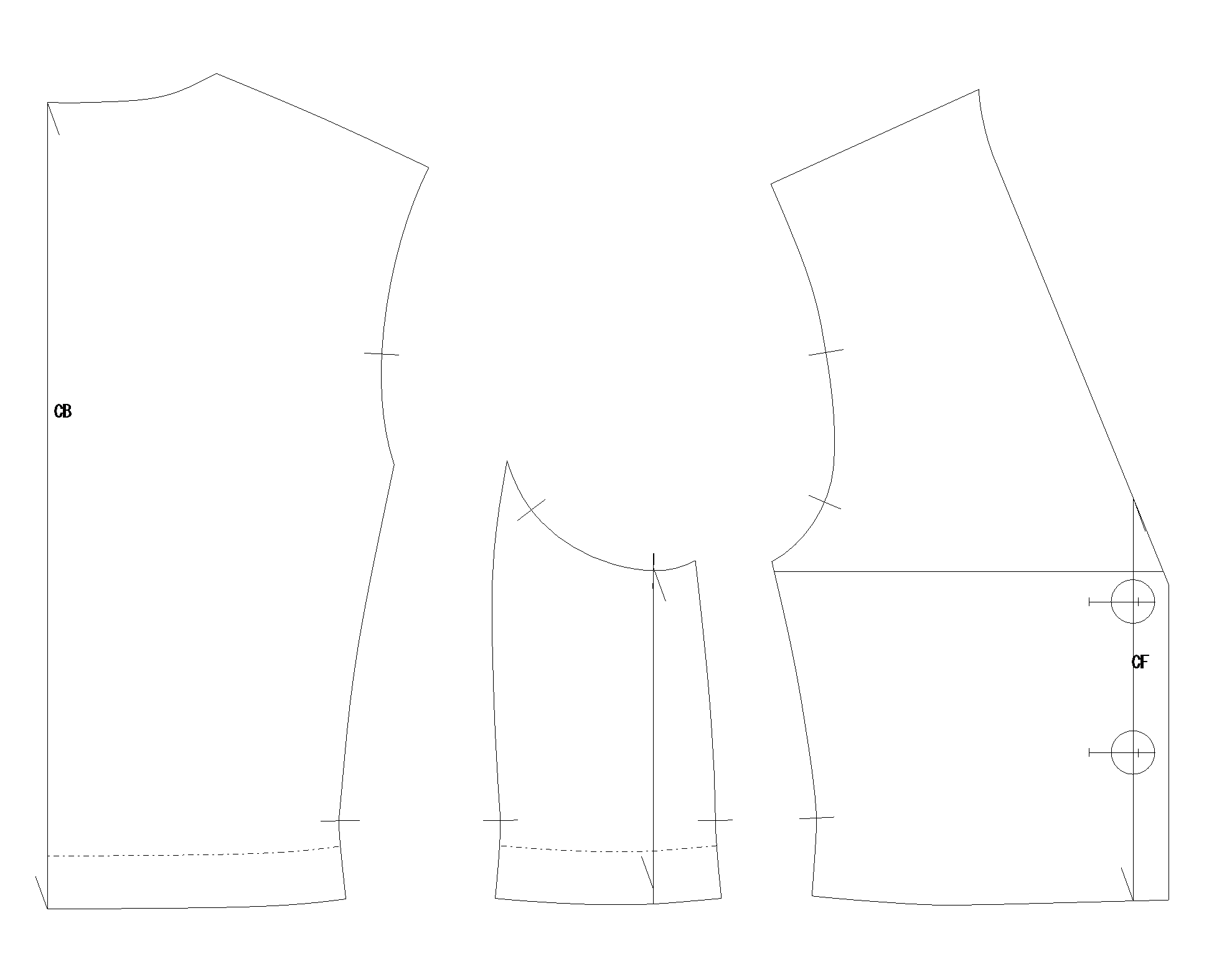 今回参考にしたジャケットの仕様は前身頃の形と全く同じ見返しパーツが付き、脇身頃、後身頃はそのまま裏地と一緒に縫い合わせて袋縫いという仕様になっています。