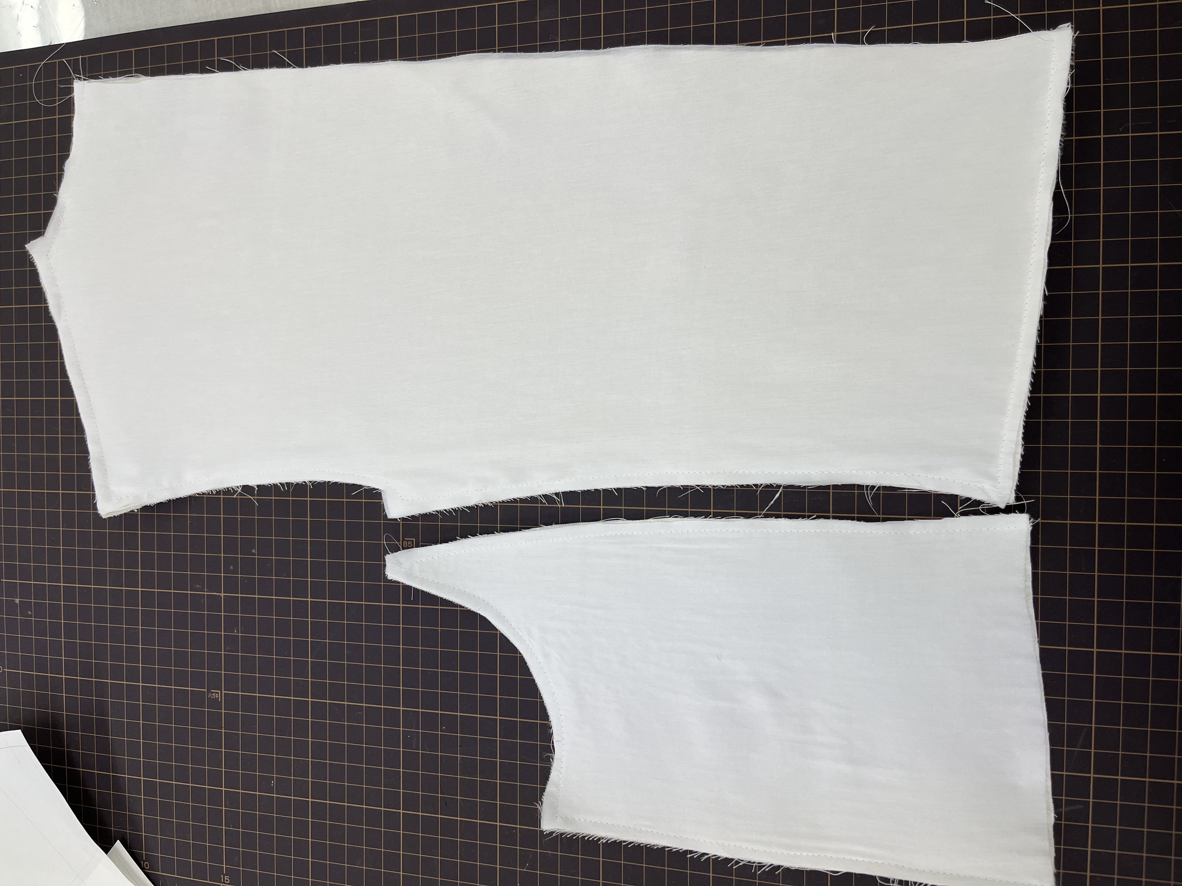 まず地縫いの前に表地と裏地を各パーツ仮止めします。この時、後ろと脇の切り替え部分は袋縫いするので捨てミシンを入れますが、ややいせ気味に縫います。