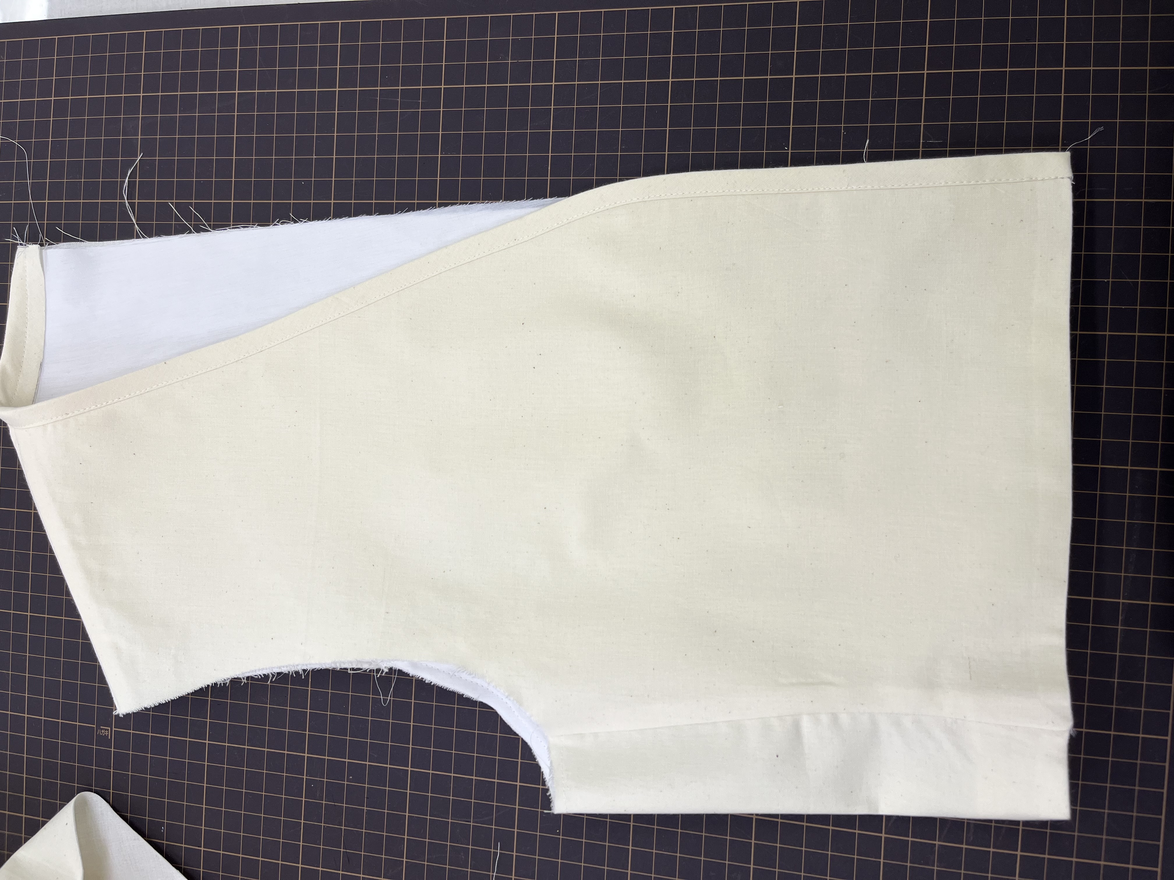 前身頃だけは全面見返しになるので、前脇は中縫いして表と裏で包み、裾と肩線が中縫いされ、前端はバイアステープで包むという仕様になっていました。