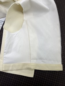 少し変な仕様ではありますが、実際に縫ってみて感じたことは、身頃は前も後ろも全面芯にしていたことを考えると、裏打ちにしていた理由はやはり型崩れを防ぐためではないかと思います。また、袋縫いにしているのもきれいな形を保ったまま、ある程度の丈夫さがほしいという、スポーツジャケットならではの考え方ではないかと思います。