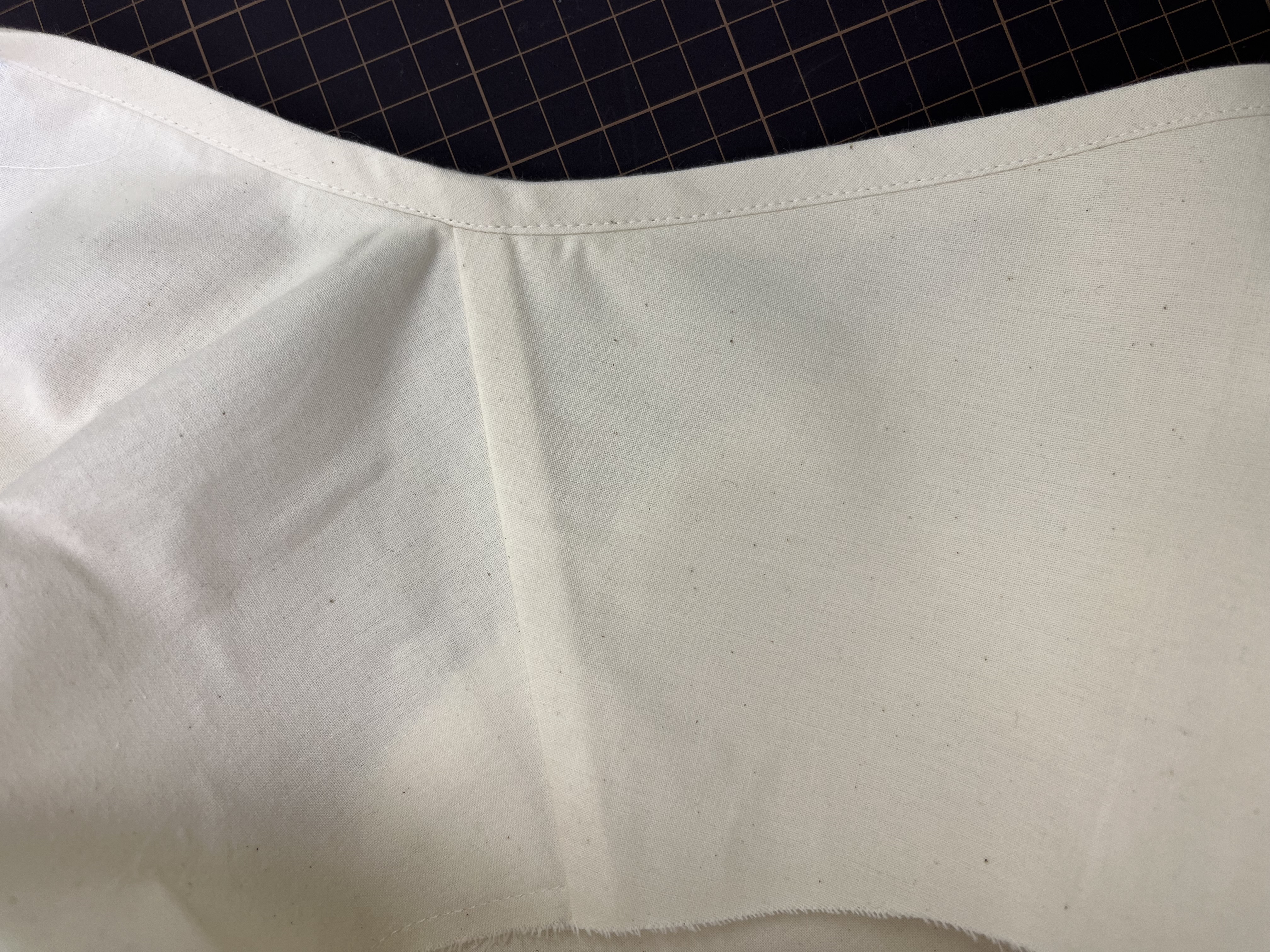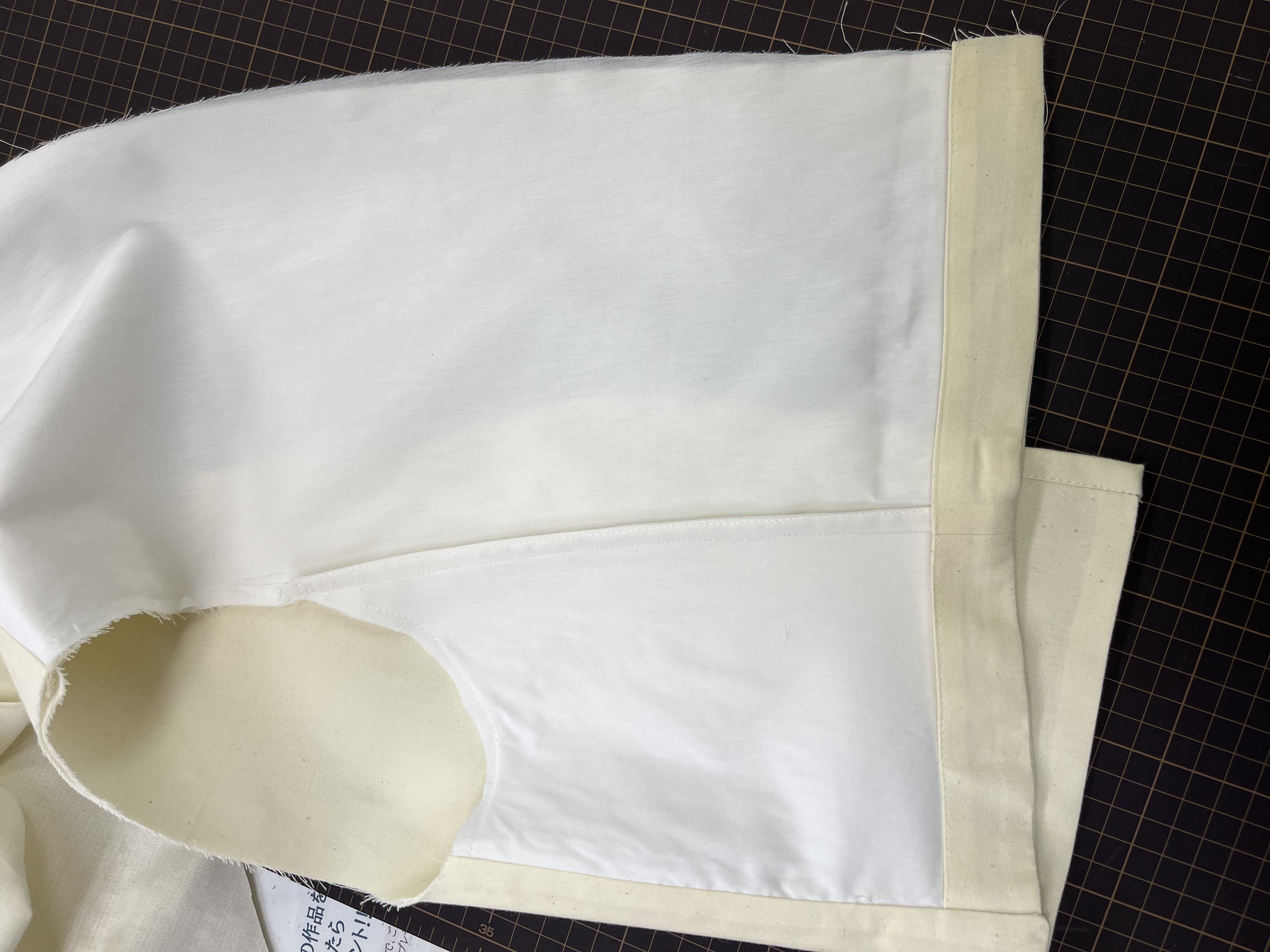対して裏打ちは先ほどのタックのように表と一緒に縫いこむ仕様になります。裏打ちは裏地のゆとりは入れない場合も多いので、伸縮性のある素材を裏地に使うのがおすすめです。ただ、裏打ちにする理由として、運動量というよりは表地の保形や強度を上げるなどの目的のほうが強い気がします、、