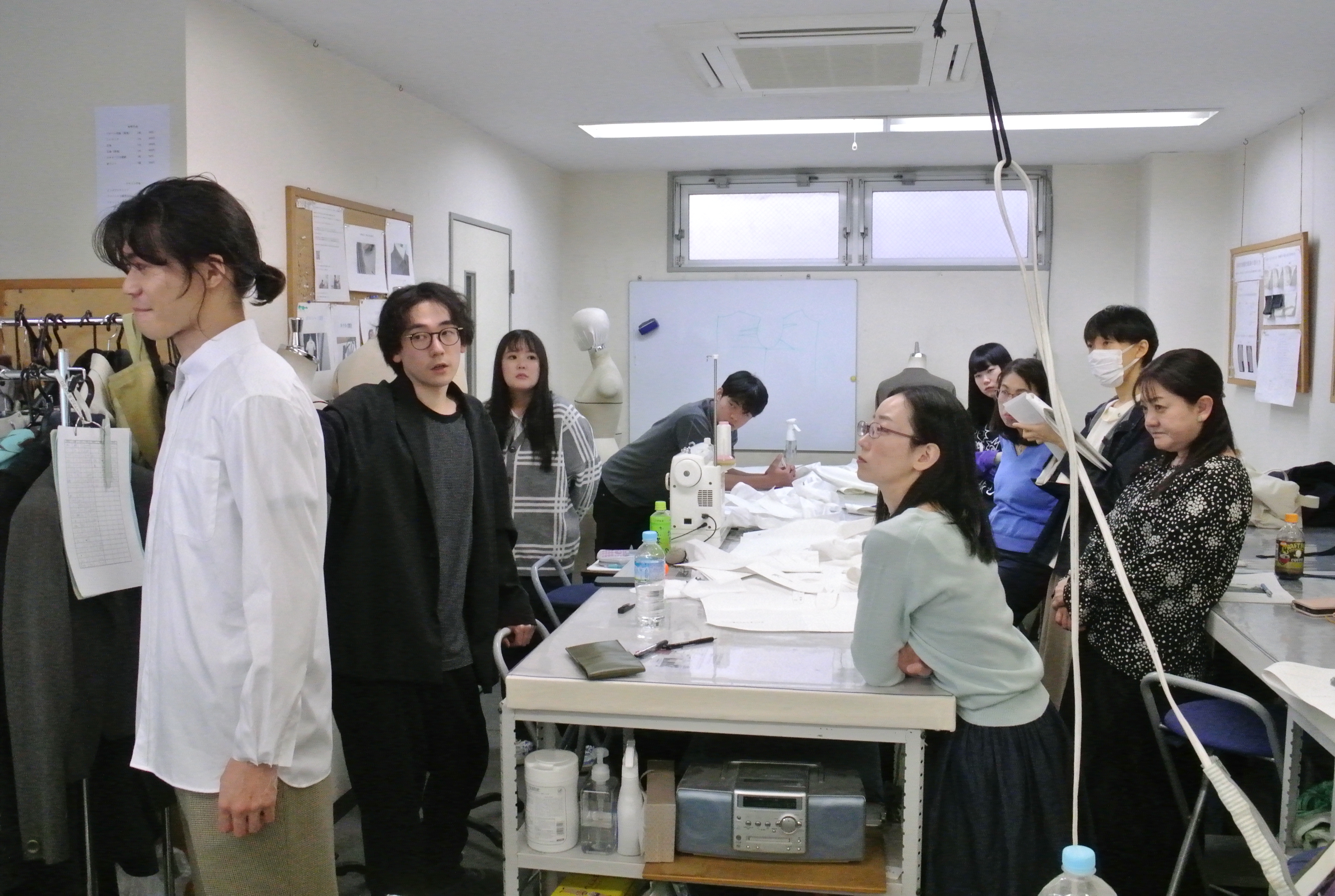 また、男性の生徒さんに実際に試着してもらい、体型的な不具合についてもプラスでご紹介し、自分体型の服作りをする上で確認するべき点などをご紹介しました。普段パターンの授業でかなり進まれている方が多かったので、皆さんこの場合はどう補正するんですか、というような質問をしていて、とても有意義な時間となりました。